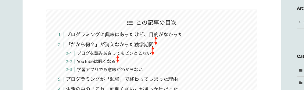 今回のカスタマイズで、目次の行間を広げることをしました。結果、読みやすさがぐっと改善されました。