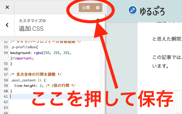 この画面にCSSを入力すると、目次一覧の行間が広がり、読みやすさがぐんとあがります!