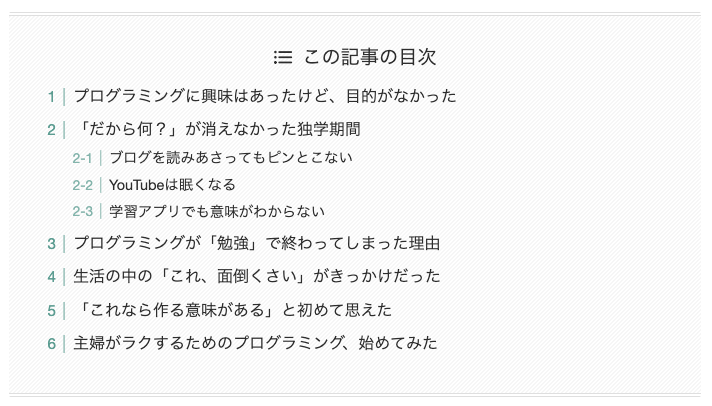 ブログ記事を書き進めるなかで、「目次の見にくさ」が気になり改善しました。