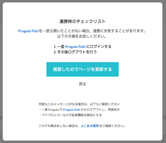 途中で「Progate Pathとのアカウント連携が必要」というメッセージが出て、進めなくなる場面があり…